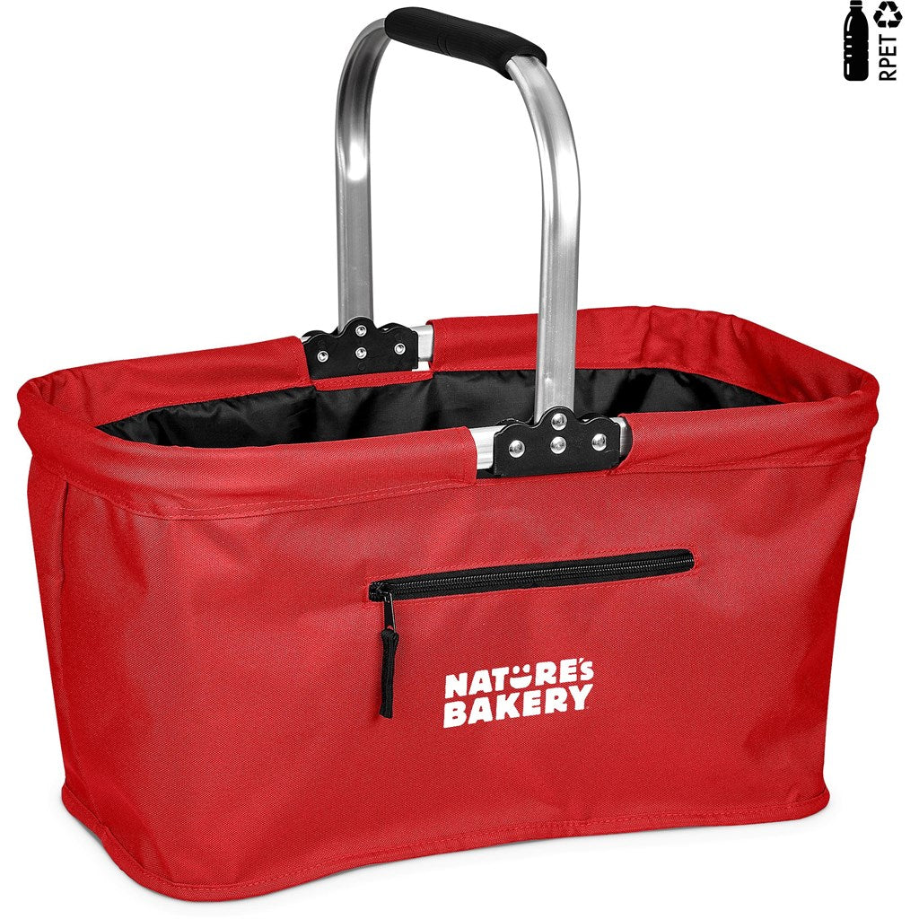 This multi-use basket is made from RPET Polyester material, with an aluminium frame. RPET is material made from recycled plastic bottles. Great for carting your everyday stuff around or for shopping, but also makes for a picnic basket that is easy to pack, unpack and carry.